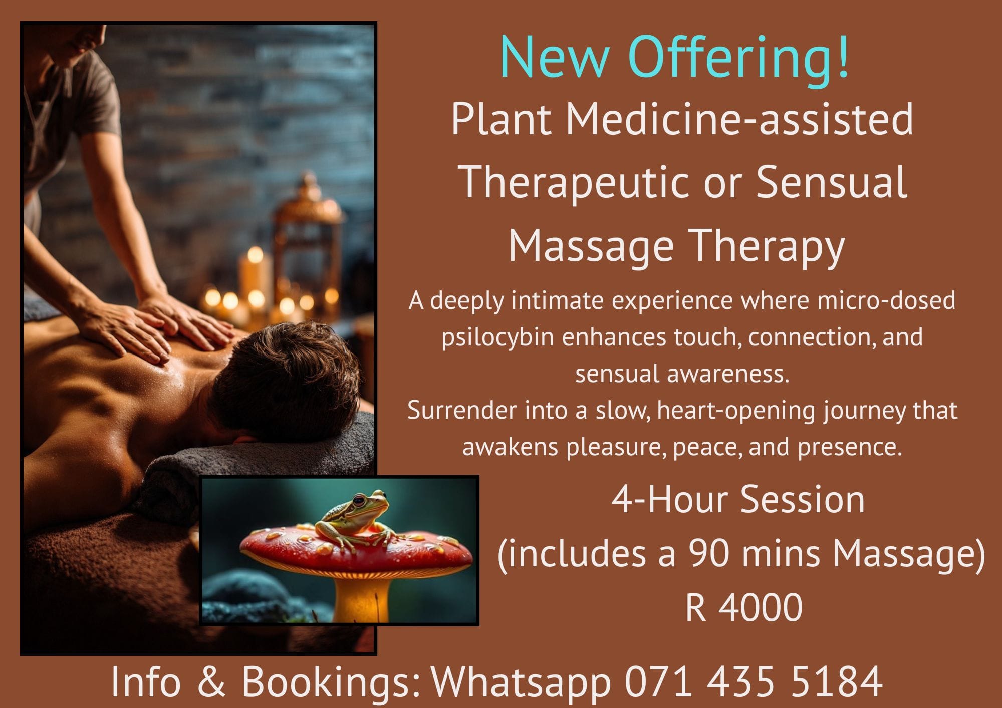 Once the medicine gently takes effect, a 90-minute massage—either therapeutic or sensual, according to your preference—guides the body and mind into profound harmony.