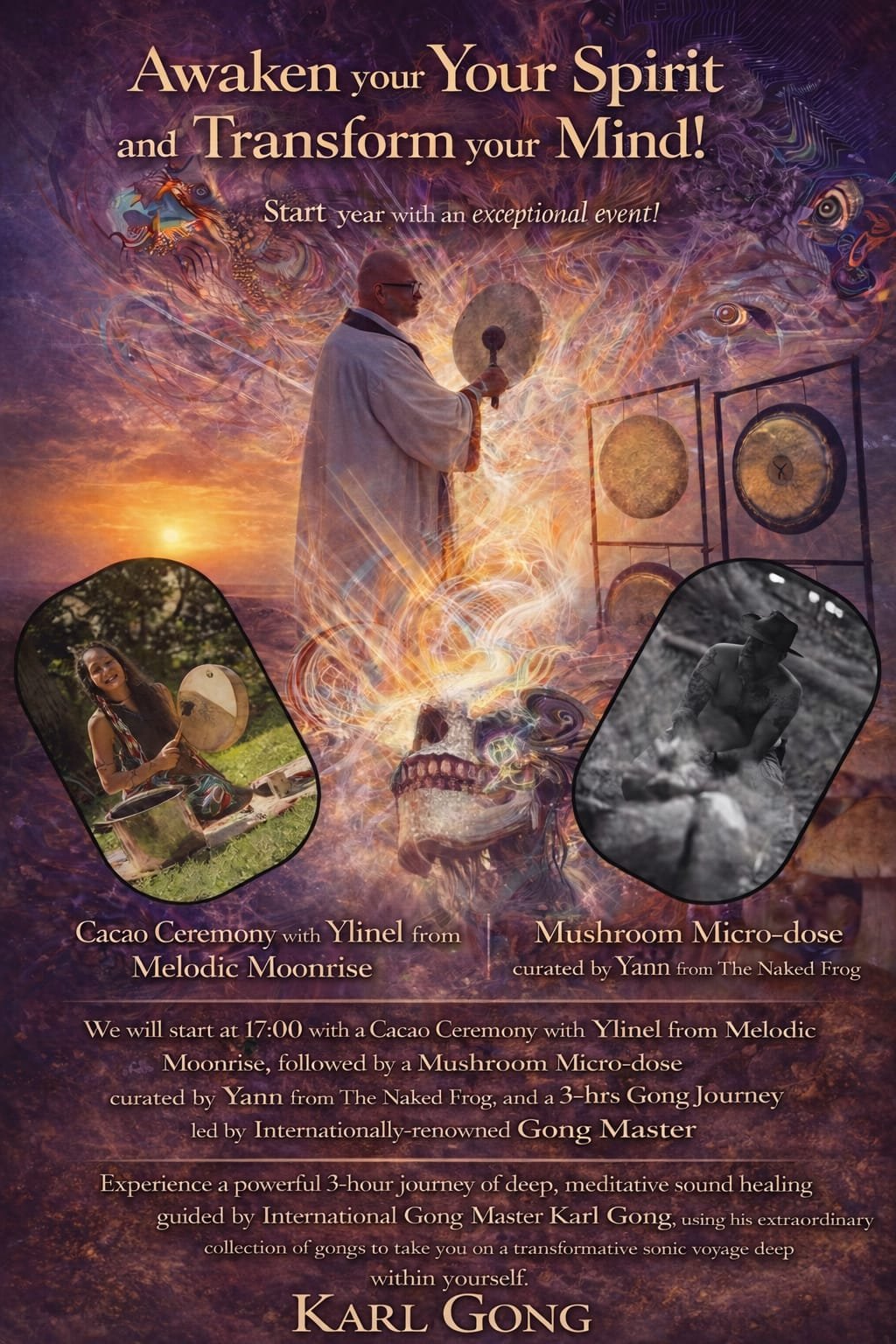 We will start at 17:00 with a Cacao Ceremony with Ylinel from Melodic Moonrise, followed by a Mushroom Micro-dose, curated by Yann from The Naked Frog, and a 3-hrs Gong Journey by Internationally-renowned Gong Master Karl Gong.