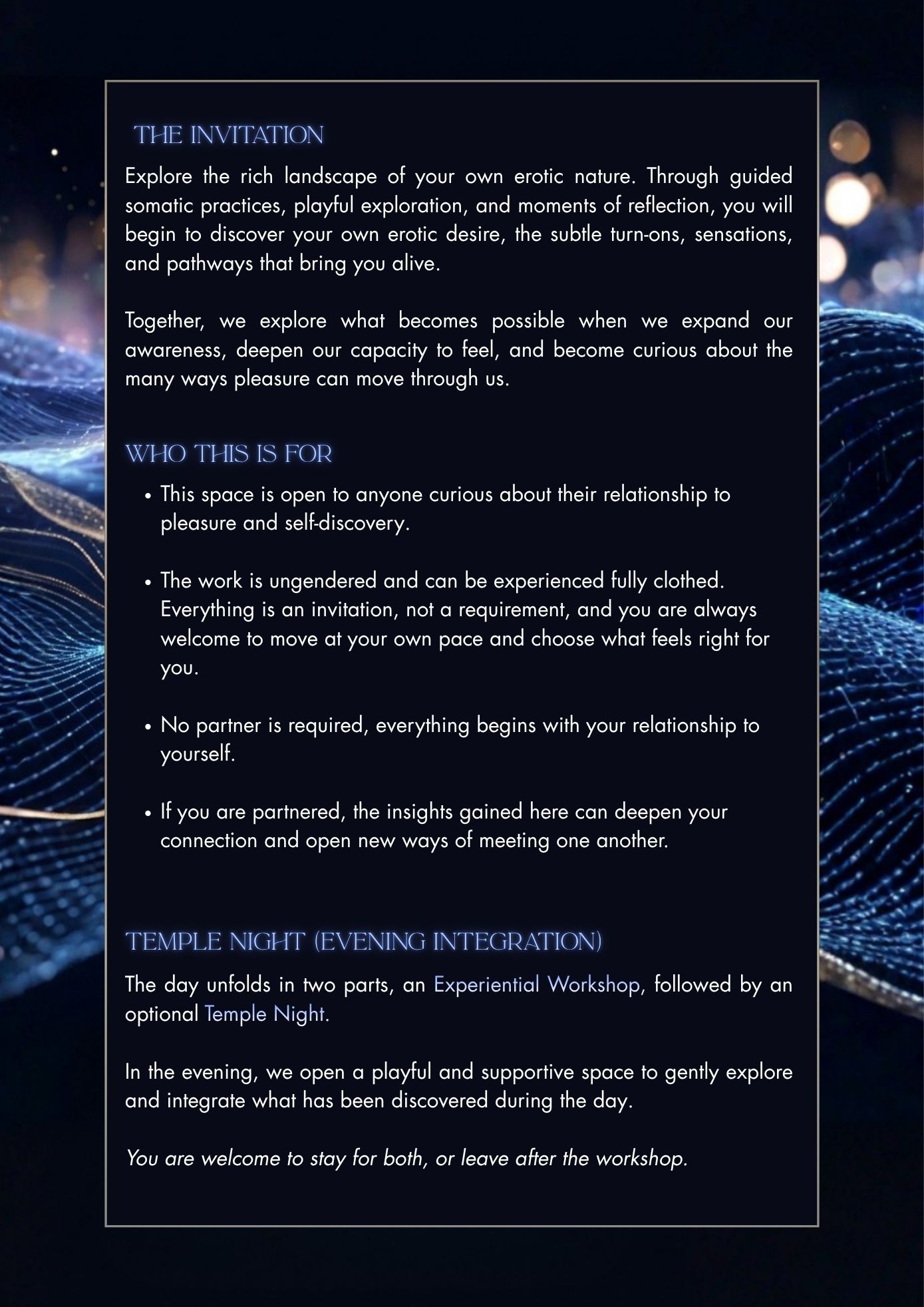 Explore the rich landscape of your own erotic nature. Through guided somatic practices, playful exploration, and moments of reflection, you will begin to discover your own erotic desire, the subtle turn-ons, sensations, and pathways that bring you alive.