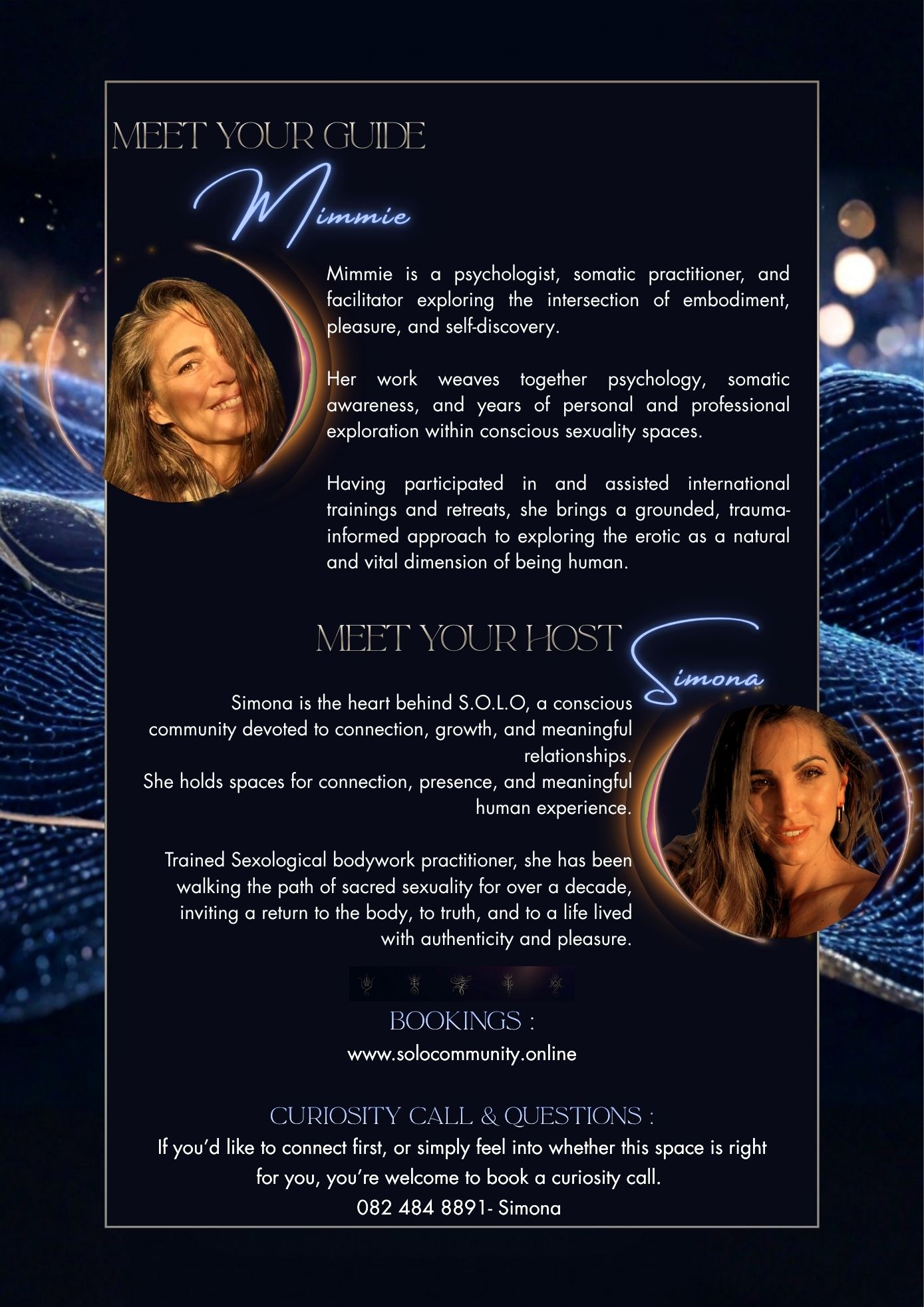 Together, we explore what becomes possible when we expand our awareness, deepen our capacity to feel, and become curious about the many ways pleasure can move through us.